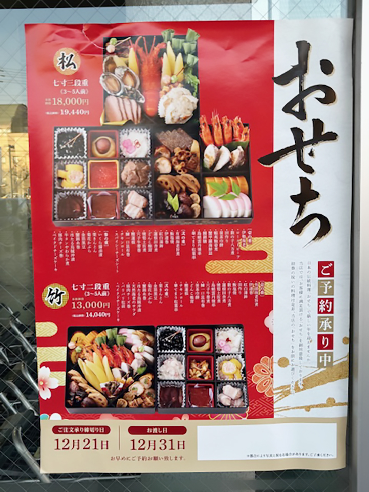 ★「おせち料理」のご予約を受付中です!JAの「リジェール松山」がご用意いたします、「松」七寸三段重3~5人前 税込19440円、「竹」七寸二段重3~5人前 税込14040円。内容のお写真を「太陽市」に掲示しています。ご予約は、「太陽市」(愛菜広場) TEL 089-913-7707まで。ご注文承り締切日 12月21日、お渡し日 12月31日です。