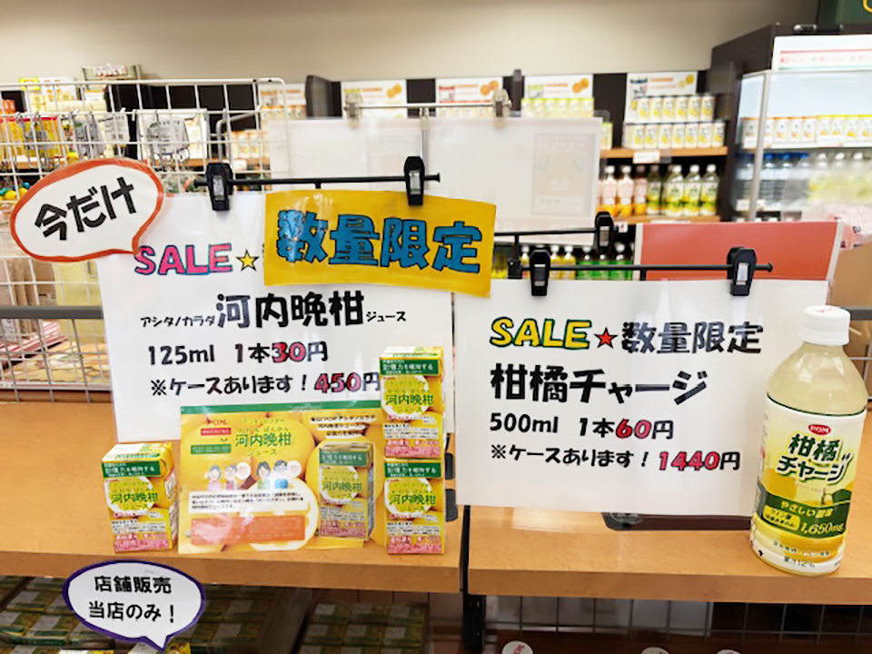 ★数量限定!今だけSALE商品あります!ひとつは、「POM アシタノカラダ 河内晩柑ジュース」(125ml)、なんと1本30円です!もうひとつは、「POM 柑橘チャージ」(500ml)、なんと1本60円です!お急ぎください!