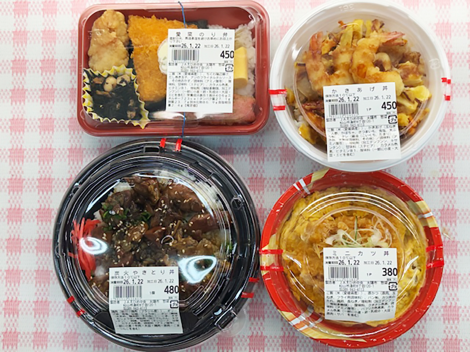 炭火やきとり丼、愛菜のり弁当、かきあげ丼、ミニカツ丼