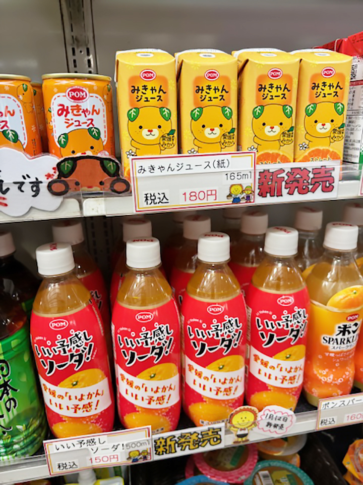 ★愛媛の「いよかん」いい予感!POM「いい予感しソーダ!」(500ml 税込150円)とPOM「みきゃんジュース」(紙パック 165ml 税込180円)、新発売です!
