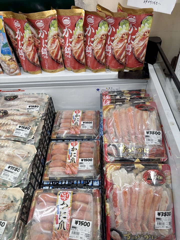 新鮮さと豊富さについ立ち止まる「鮮魚コーナー」にて、鍋物用冷凍かに(かに爪、ずわいがに<ボイル>)、かに鍋つゆ、販売中です!