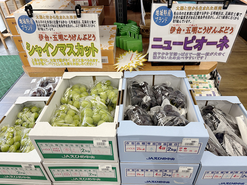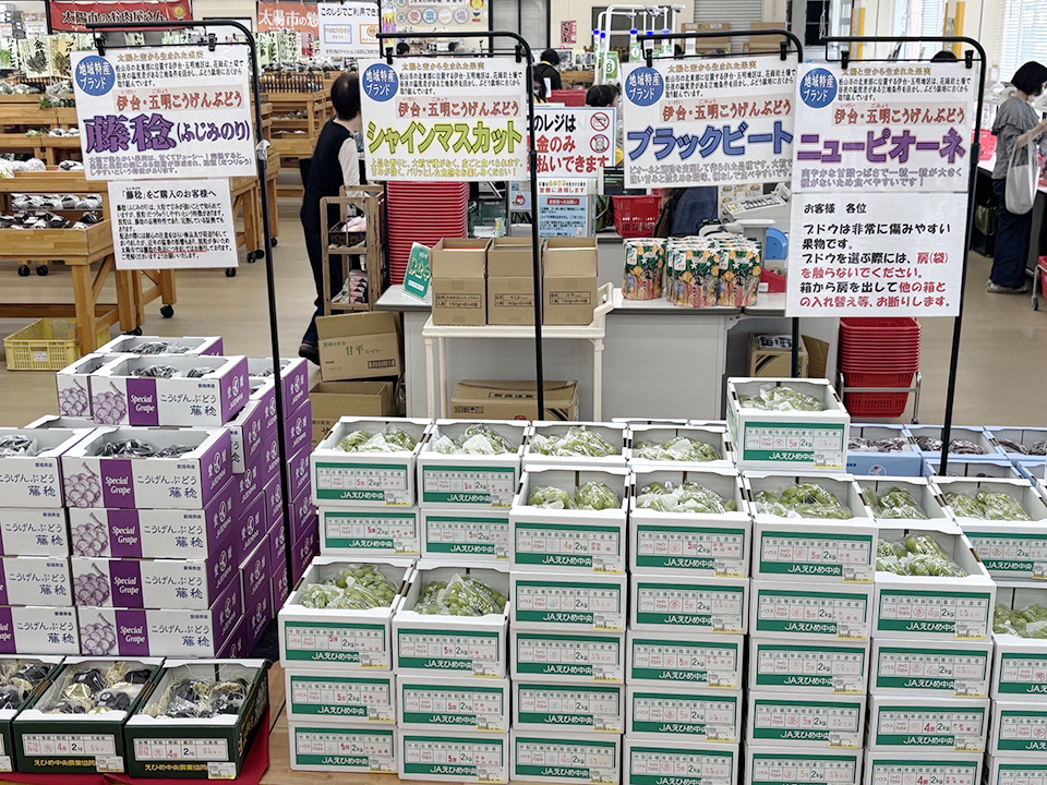 「太陽市」には、地域特産ブランド「伊台・五明こうげんぶどう」シャインマスカット・ニューピオーネ・藤稔(ふじみのり)