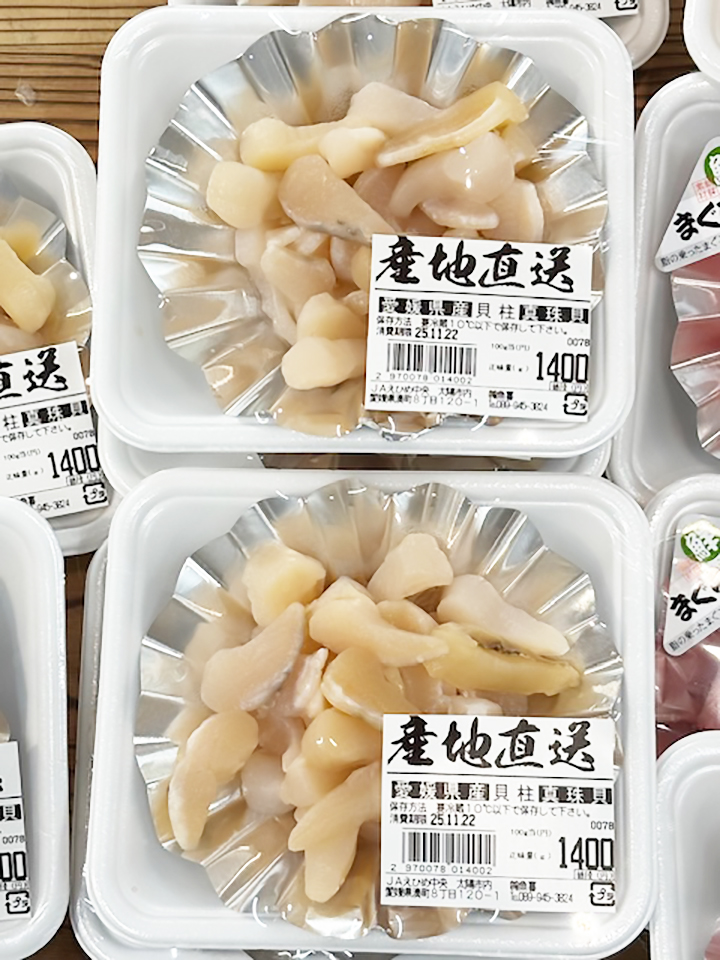 「太陽市」の「鮮魚コーナー」に、真珠貝(アコヤガイ)貝柱が入荷しています!